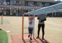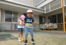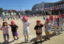 すみれぐみと玉入れをしました。円陣を組んで勝つ気マンマン。今日の勝敗は…子どもたちに聞いてみてくださいね!
