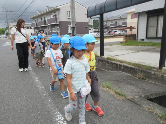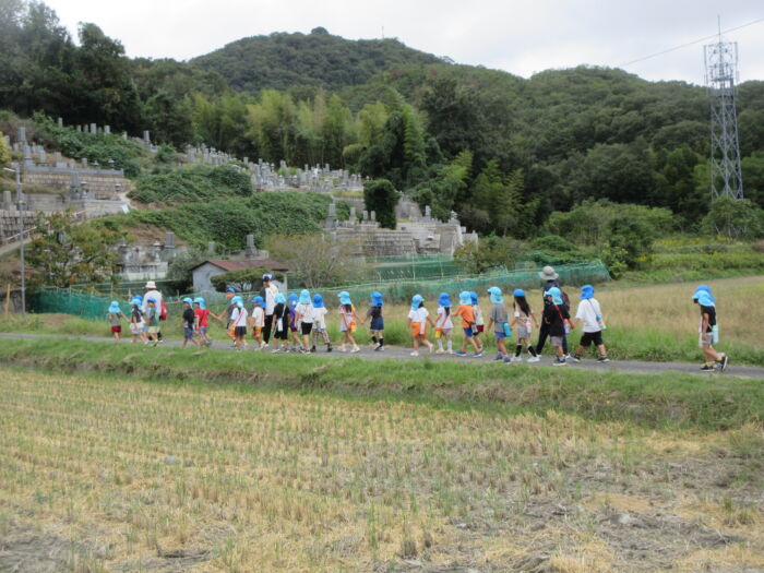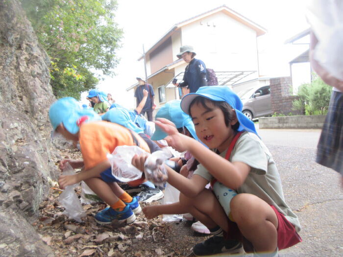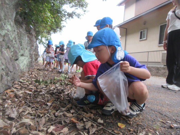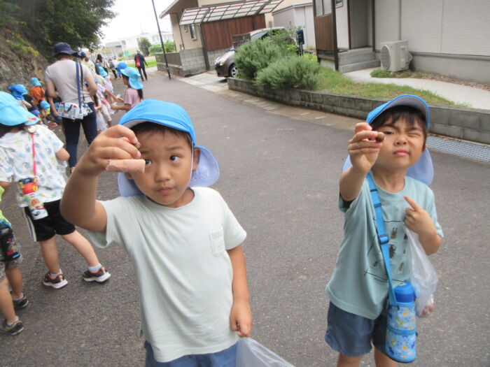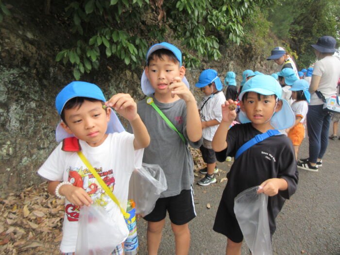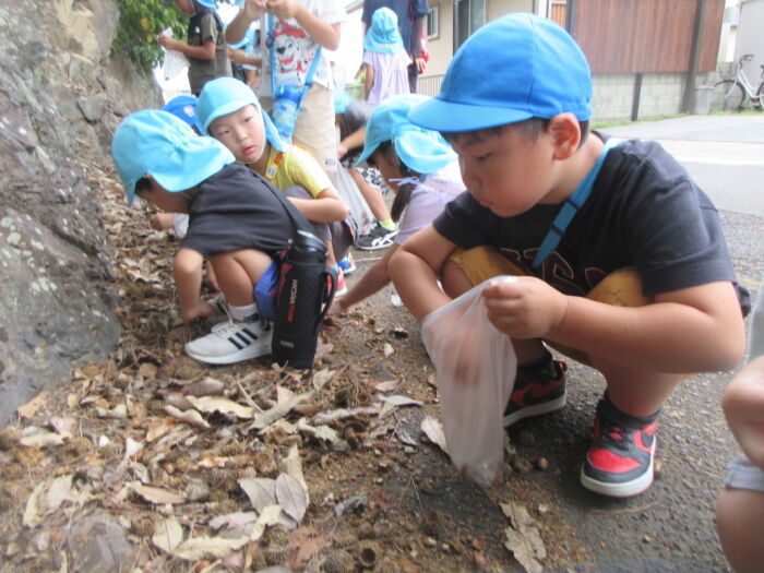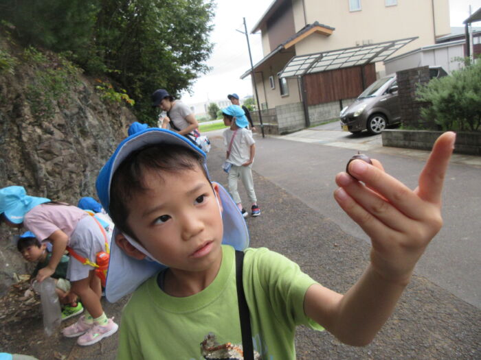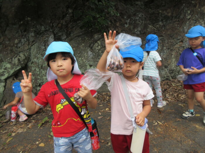 園のそばの公園の山際にドングリを拾いに行ってきました。曇っていましたが暑くもなく歩きやすかったです。どんぐりの帽子がついているものや違う帽子をかぶせてみたり、大小いろんなドングリ拾って秋を感じました。持ち帰ったドングリをどんな風にして遊ぼうか話を聞くと、どんぐり迷路やマラカス、どんぐりに色を付けて転がして遊びたいなどいろんな意見が出てきました。みんなでいろんな遊びを楽しんでいきたいと思います。