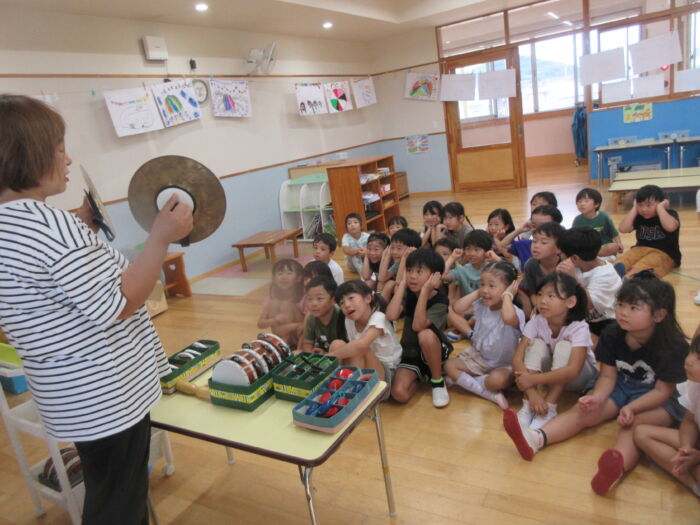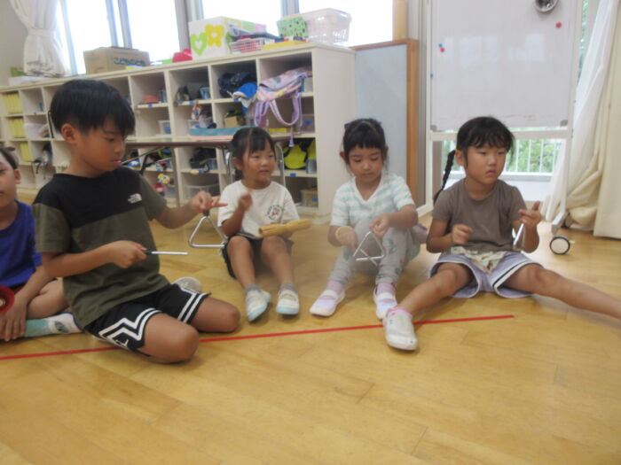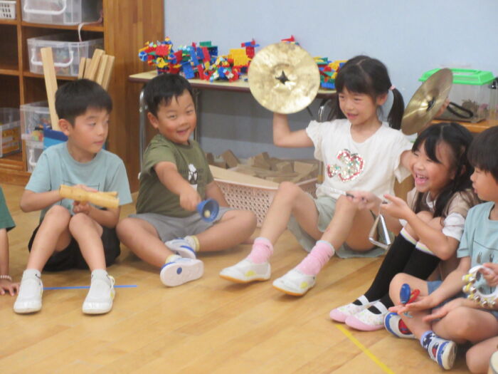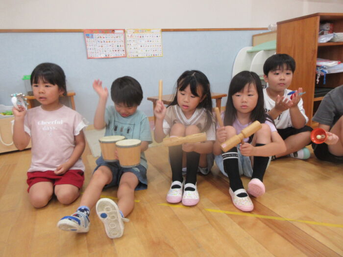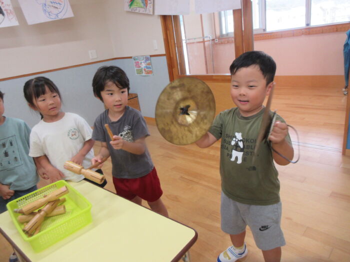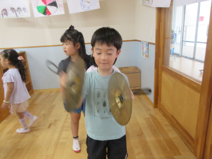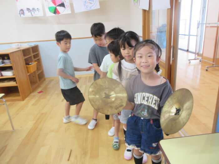 いろんな楽器にも触れあって遊びました。シンバルは争奪戦でしたが順番に鳴らしてみて楽しんでいました。音楽に合わせてみんなでフリーで合奏しましたが、最後はピタッと終わるのでびっくり!!みんなの気持ちがそろっている証拠で嬉しくなりました。発表会に向け楽しく進めていけたらと思います。
