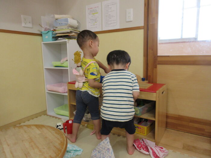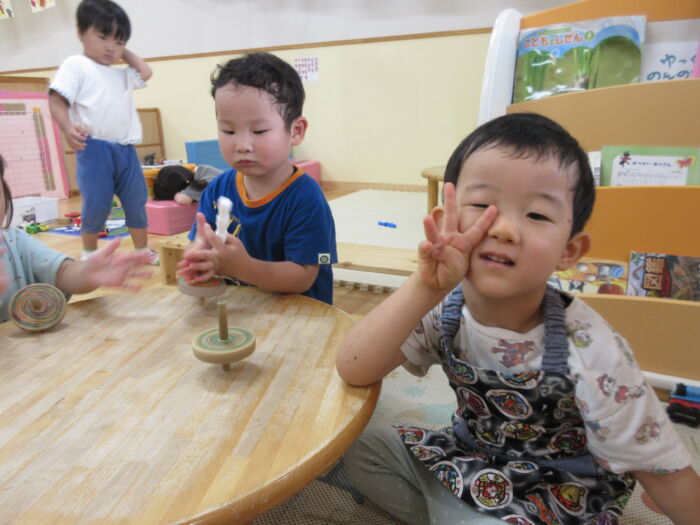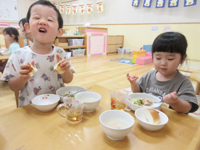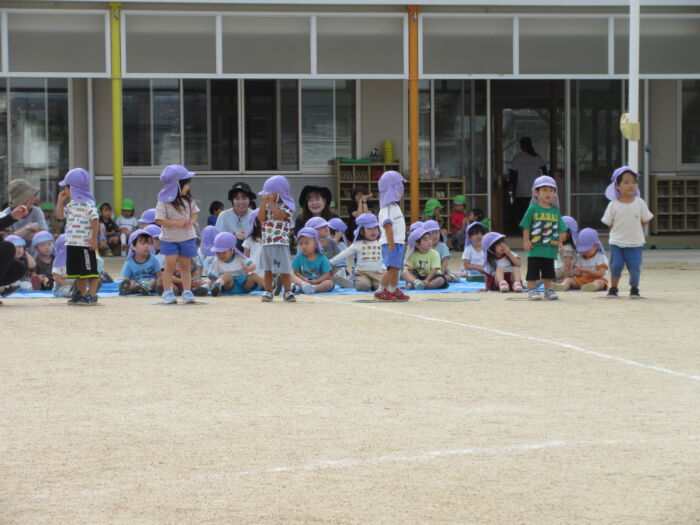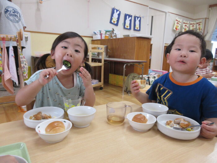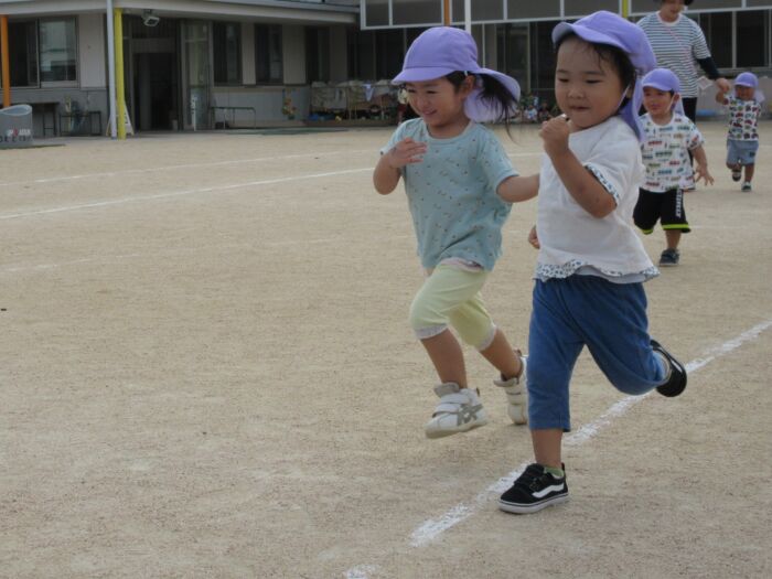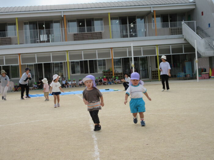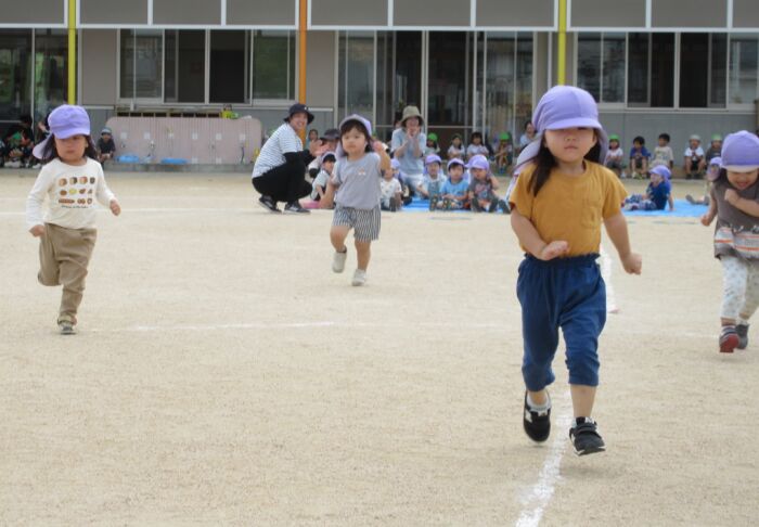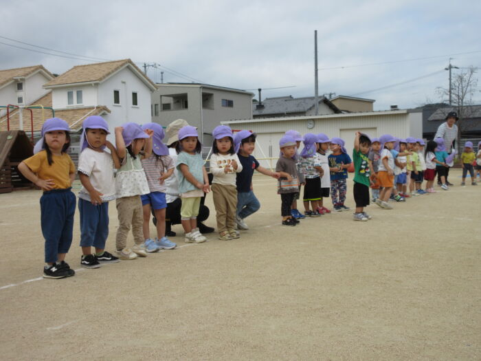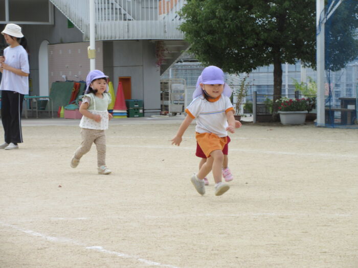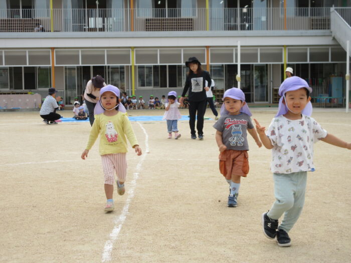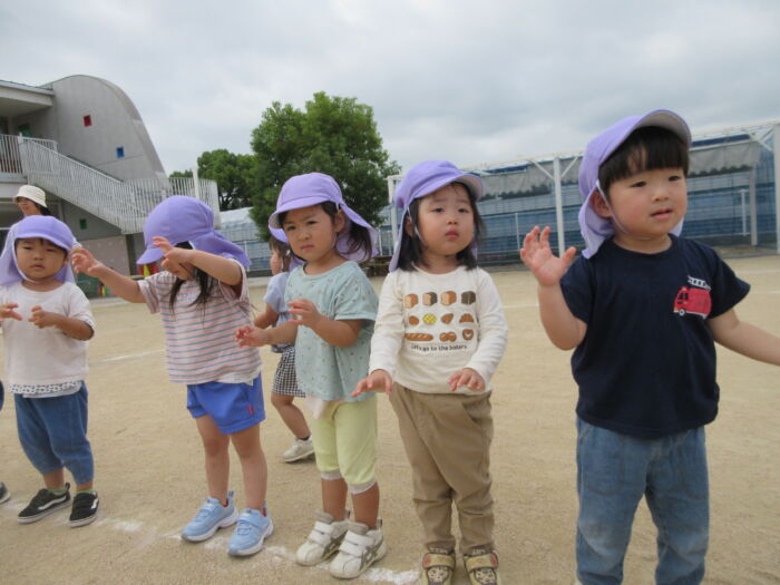すみれ2歳児 かけっこと恐竜ダンスをしました♪(すみれ組) 2025年10月14日 104 今日はかけっこと恐竜ダンスをしました♪名前を呼ばれると輪っかの中に入って「よーいドン!」の合図を待つすみれ組。とっても素敵です(*^▽^*) 恐竜ダンスは列になり、手で角を表現したり、身体をフリフリ振ったりとても可愛らしいダンスでした。 その後は乳児園庭やお部屋で好きな遊びを見つけて過ごしました。 給食に出たブロッコリー。お友だちが食べているの見ると自ら口へ運ぶ子どもたちです。