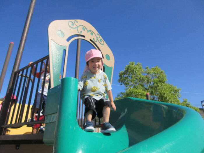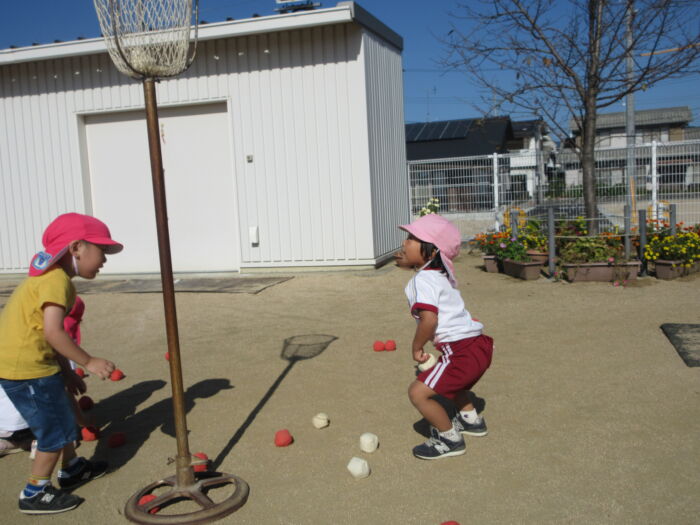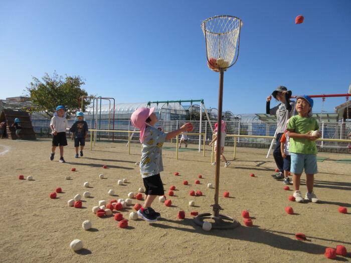 今日も天気が良かったので外で元気に遊びました!!玉入れが出ているのを見つけると「やってみたーい!」と一生懸命カゴに向かって投げ入れていました(^^♪