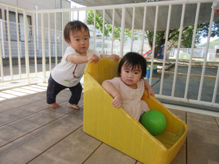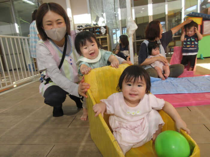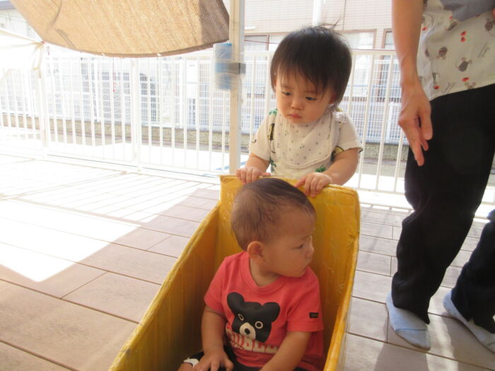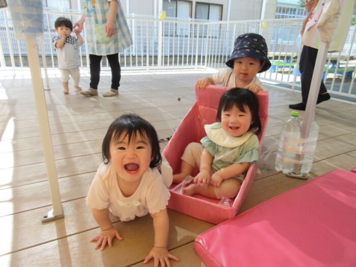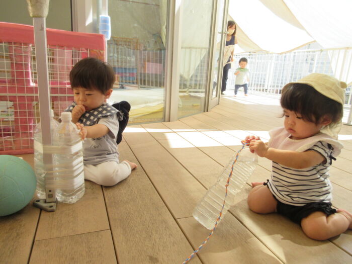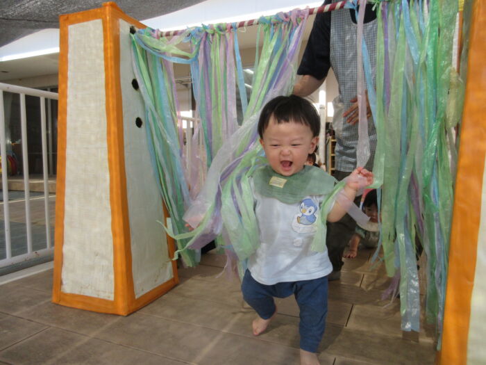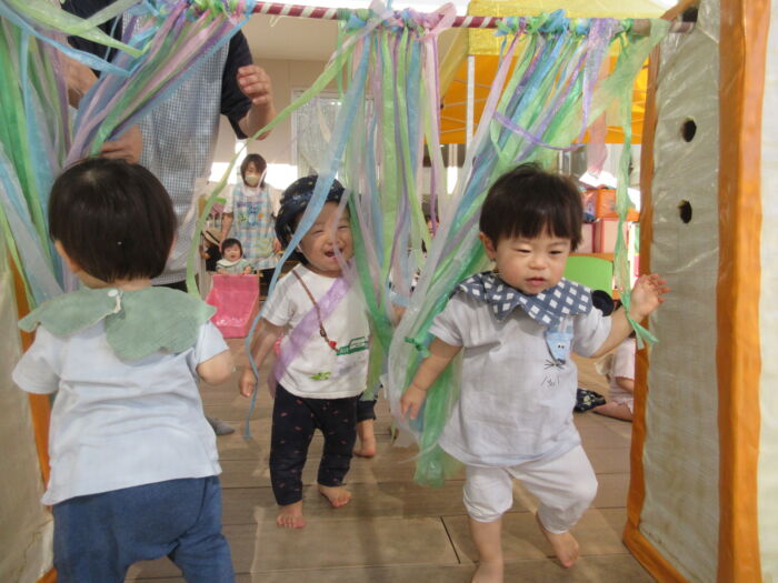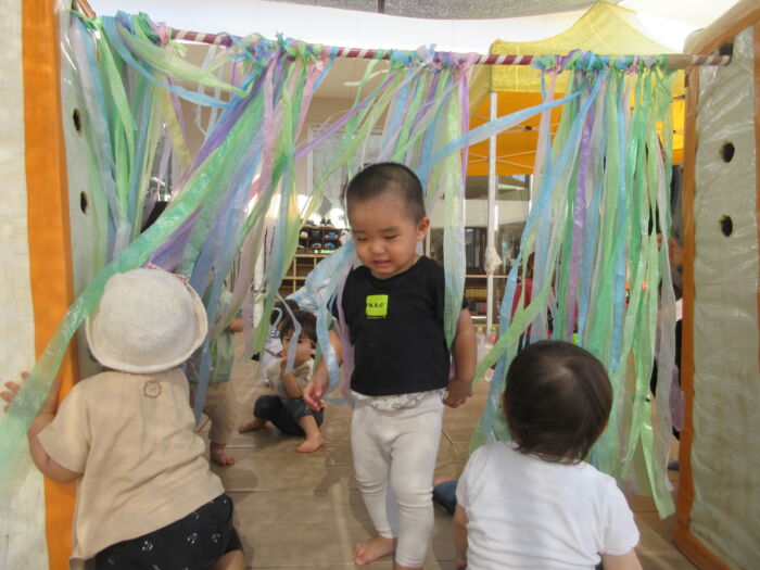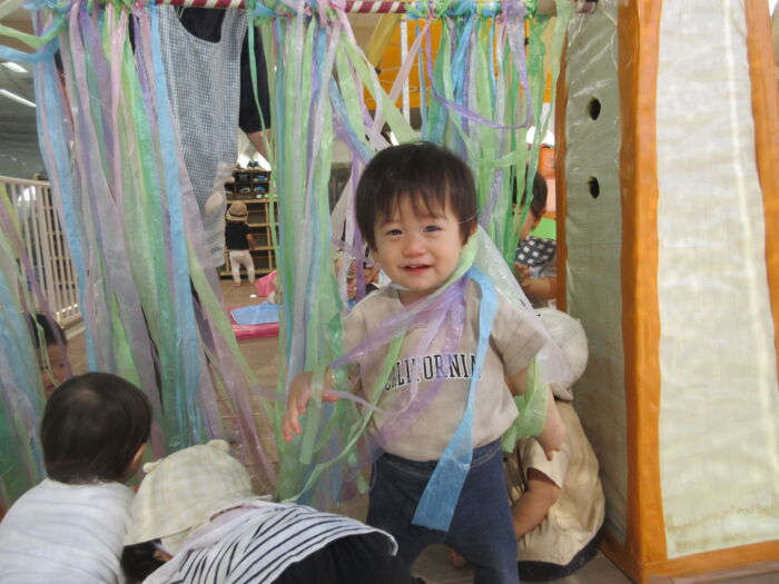 園のくらし カーテンで遊んだよ♫(たんぽぽ) 2025年10月17日 46 テラスで気持ち良い風の中、スズランテープのカーテンで遊びました! 子どもたちは風の中、フワフワとそよぐカーテンに大喜び♫ 何度もくぐって遊んだり、カーテンの中に立って 風に流れてくるカーテンに当たり感触を楽しんだりとご機嫌☆ 友だち同士でカーテンから”ばあ!”もして、楽しんだたんぽぽさんです。