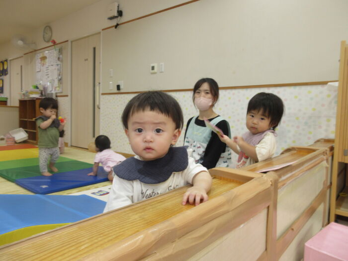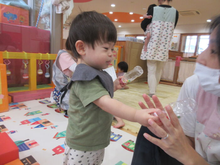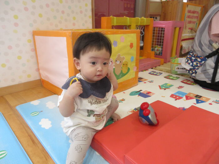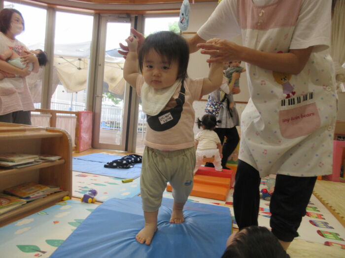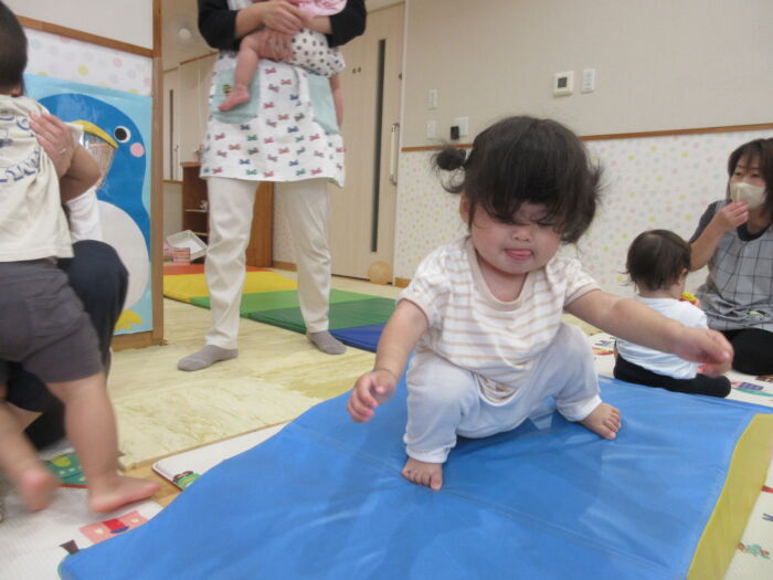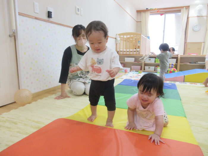 たんぽぽ0歳児 サーキット楽しいね♫(たんぽぽ) 2025年10月16日 12 今日は室内サーキットをして遊びました! 長いマットをハイハイしたり歩いて遊ぶたんぽぽさん(^^♪ 坂道・階段マットも好きで手を引いてもらって歩いてと楽しんでいます。 友だちと長いマットの上でコロコロ転がって顔を見合わせてニコニコ☆ サーキットにも慣れてきて、沢山楽しめていました。