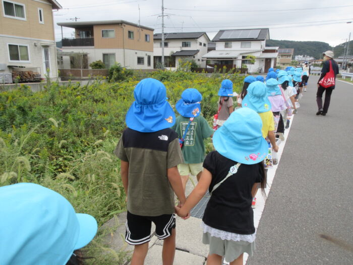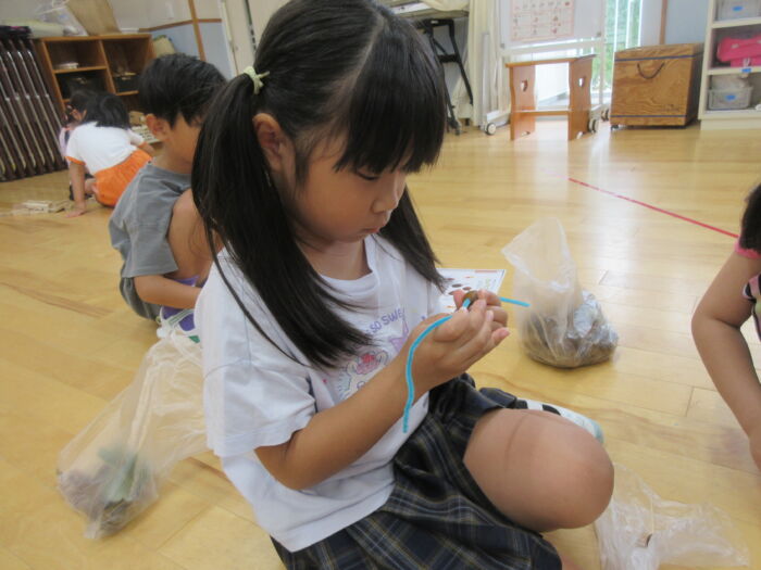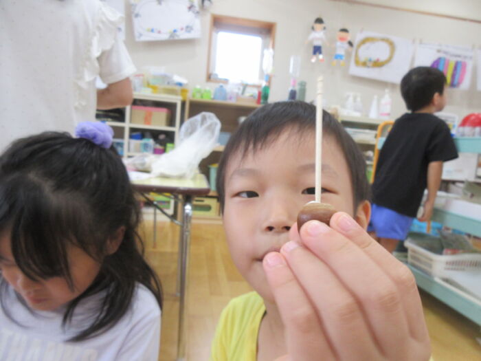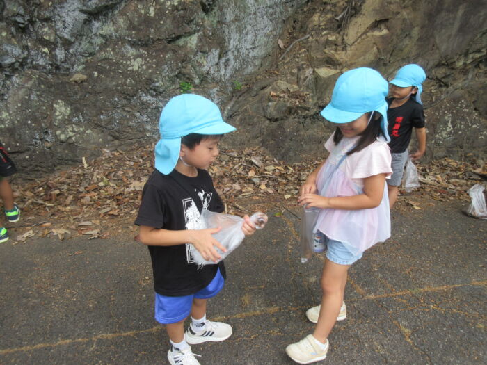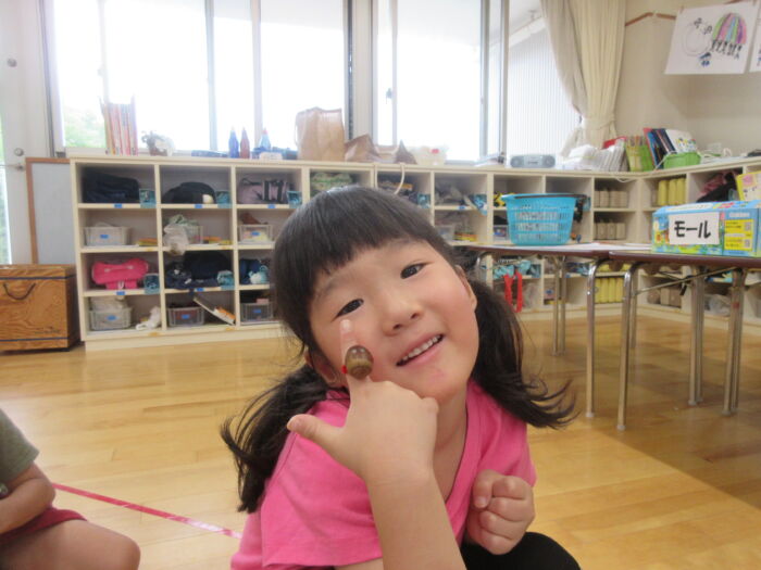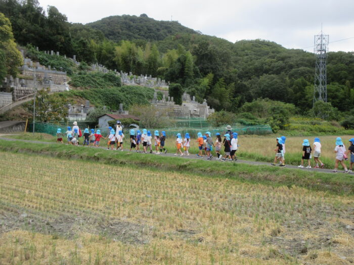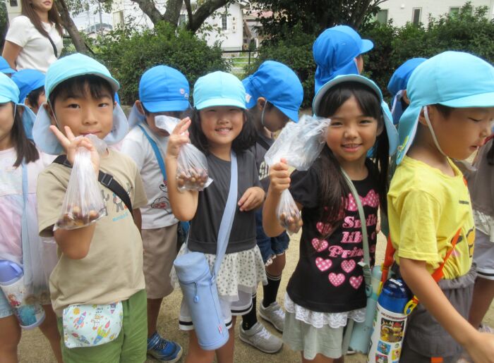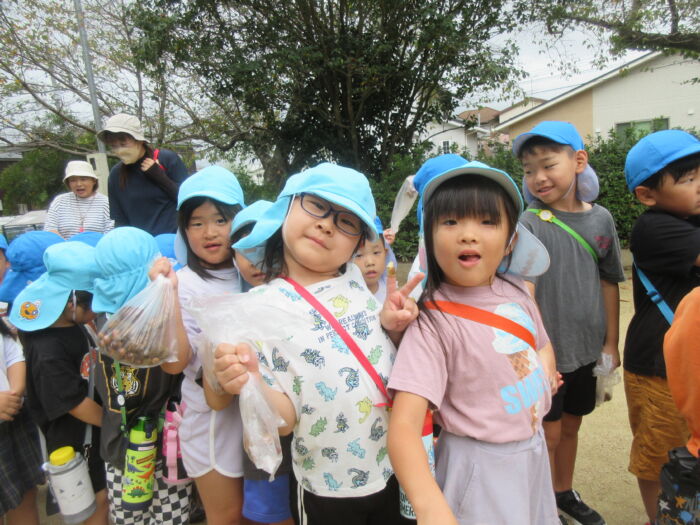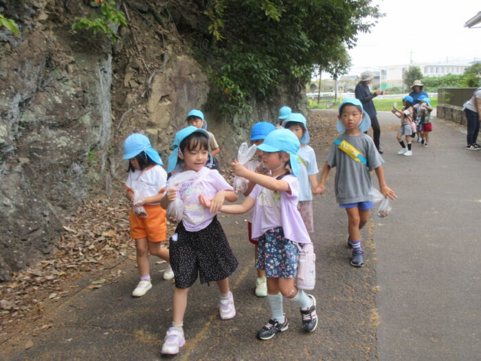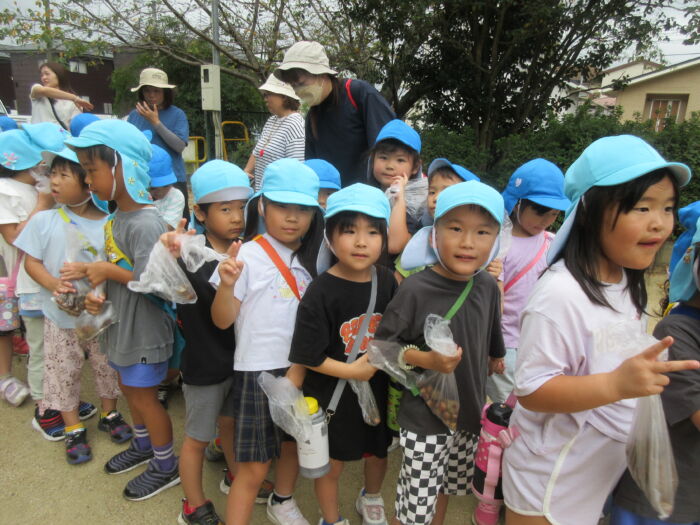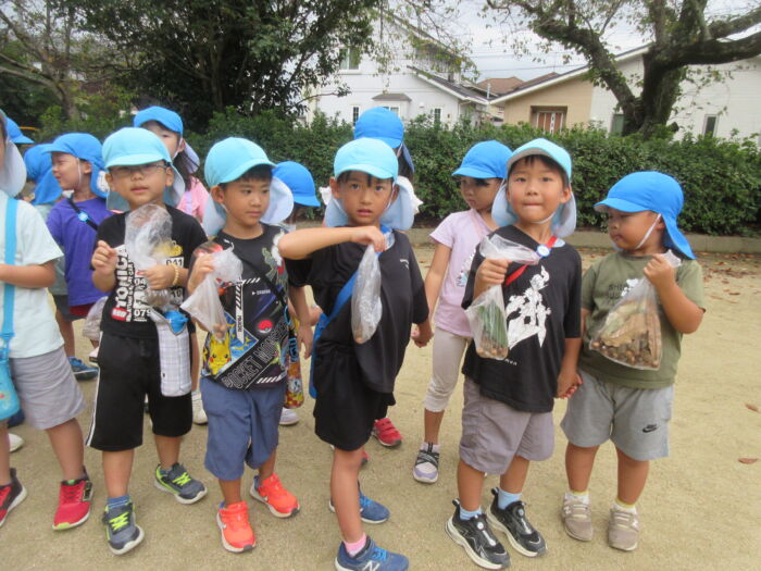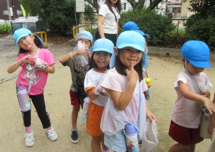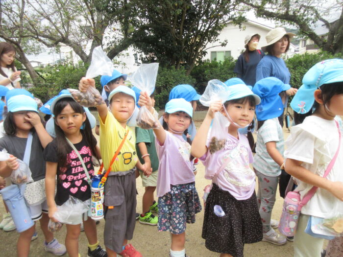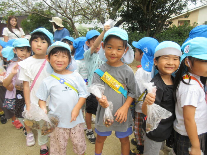 うめ5歳児 秋を探しに・・・(うめ②) 2025年10月17日 64 まだまだ暑い日が続いていますが秋を探しに散歩に行ってきました。 園からすぐの山の下にはたくさんのドングリが落ちています。 もうみんな夢中でドングリを拾い集めました。 園に帰ってからドングリを使って工作をしました。 ドングリこま、ペンダント、指輪などなど・・・ 園に帰ってからも秋を楽しみました。