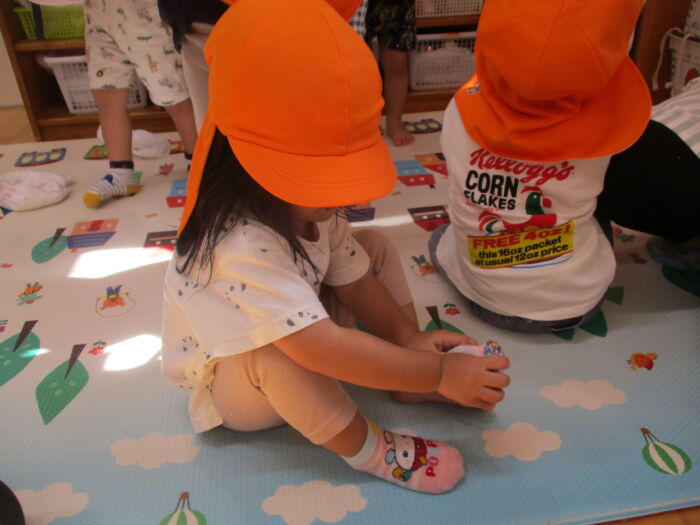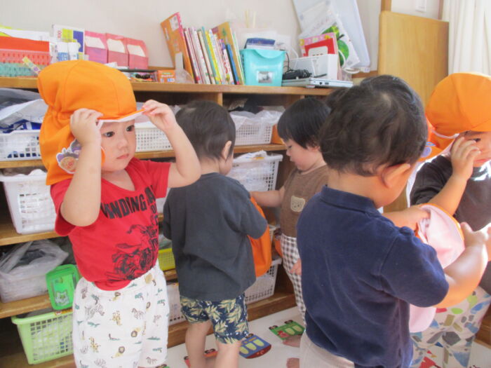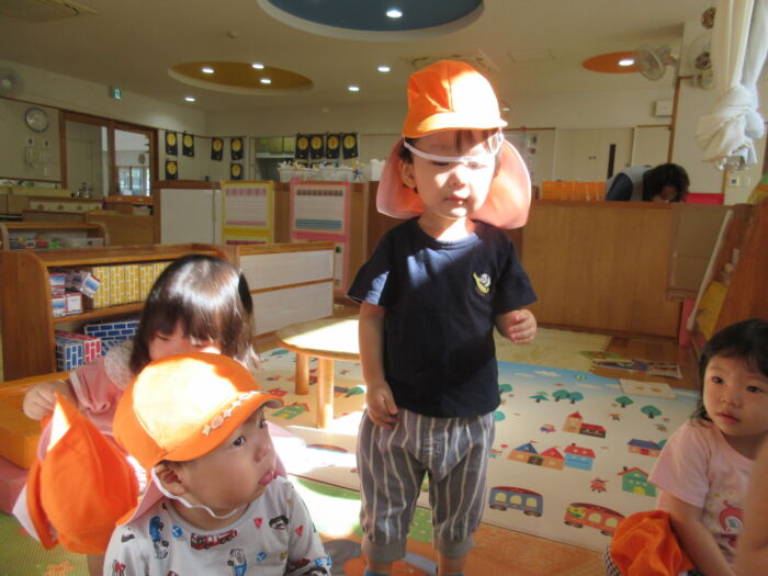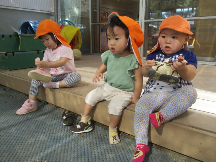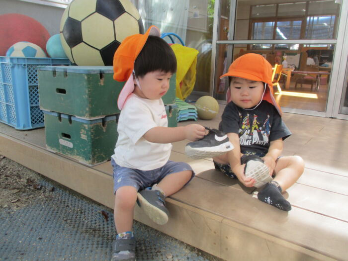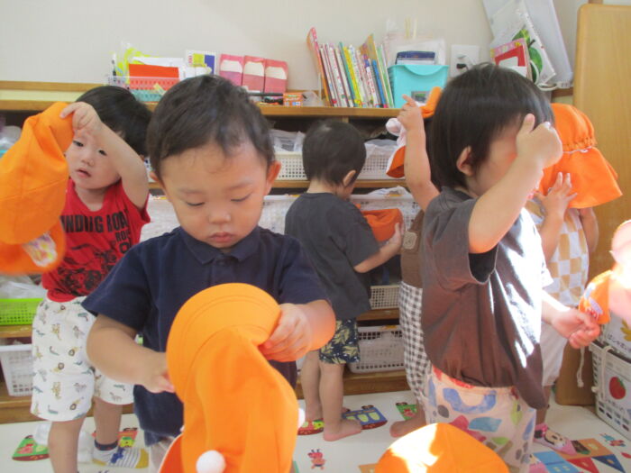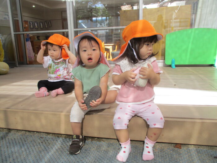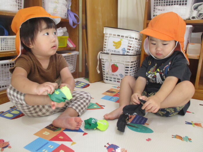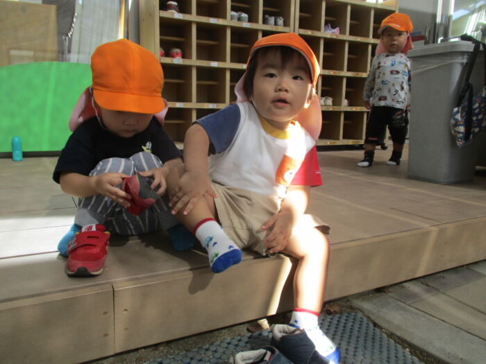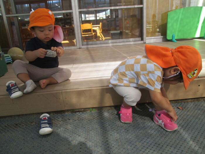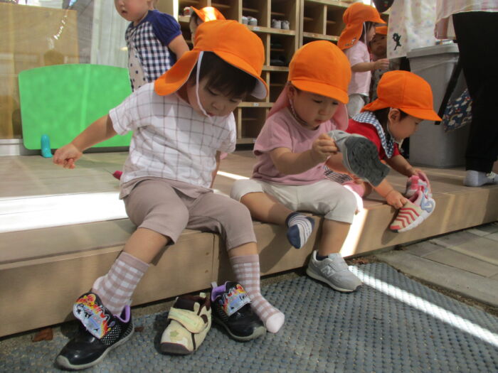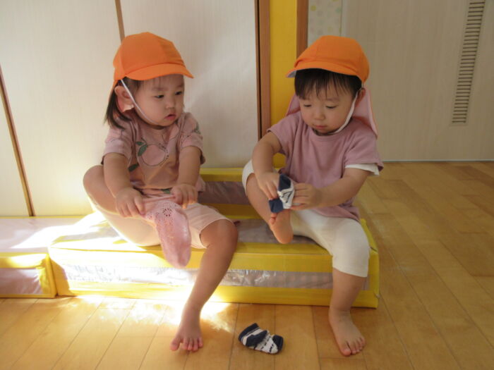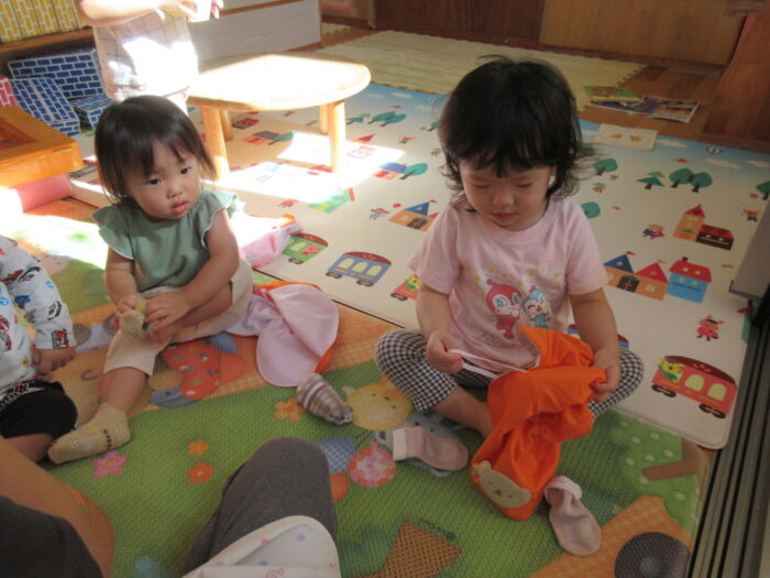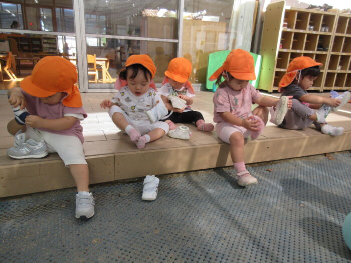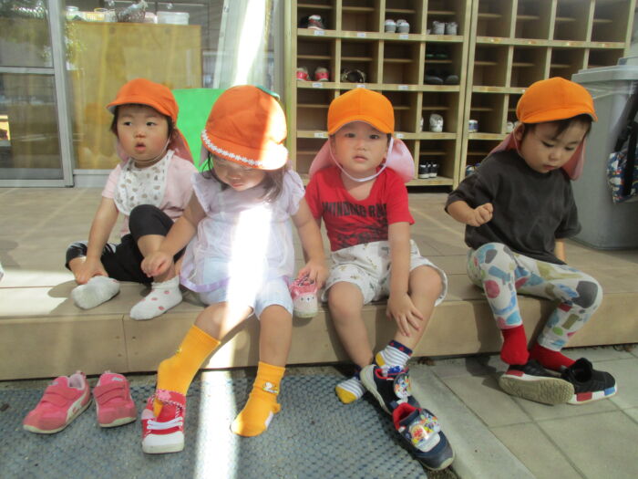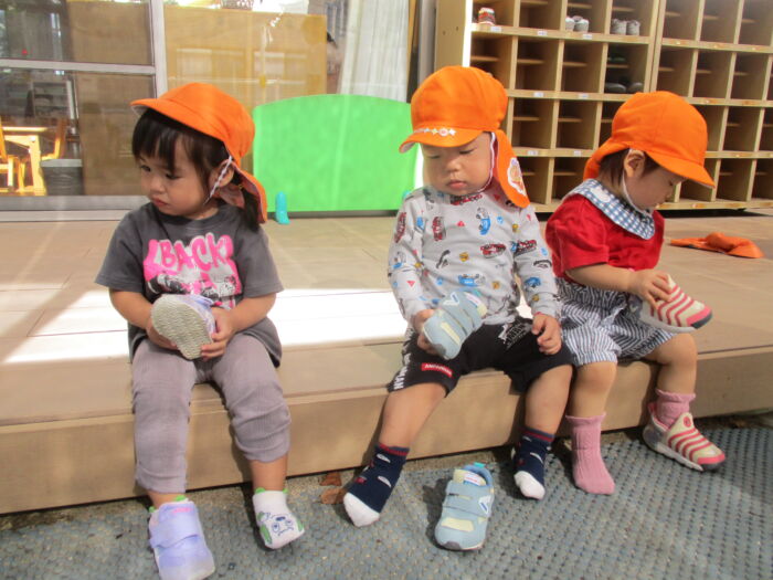 つくし1歳児 自分でできるかな?(つくし) 2025年10月6日 145 「外に行くよ~」と声をかけると、靴下と帽子を取って準備し始めます!靴下を上手に広げながら足を入れることができるようになってきました♪帽子は難しくて「せんせい手伝って!」と言う子もいますが、一緒に帽子を持ってかぶり方を繰り返し伝えていっています! 自分でしようとする姿を見守りながら上手にできた時はしっかり褒めていくようにしています☆