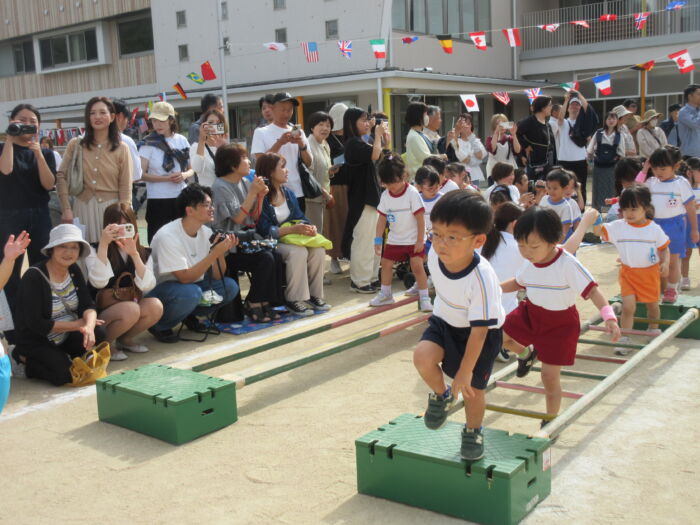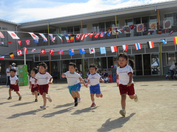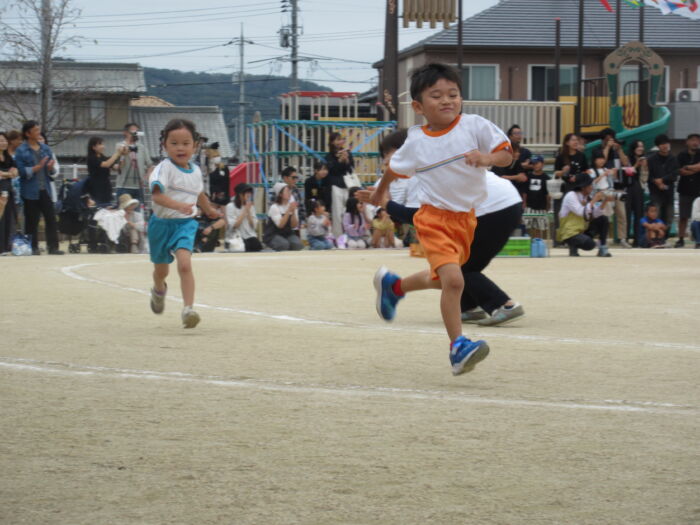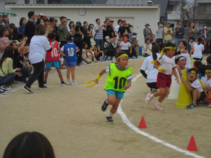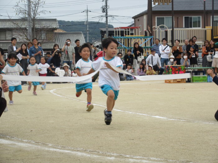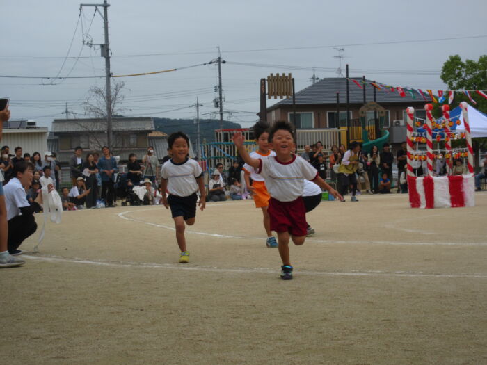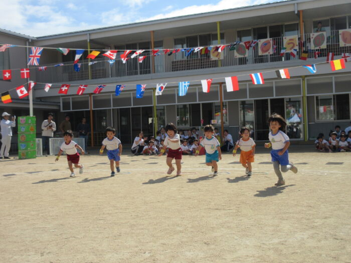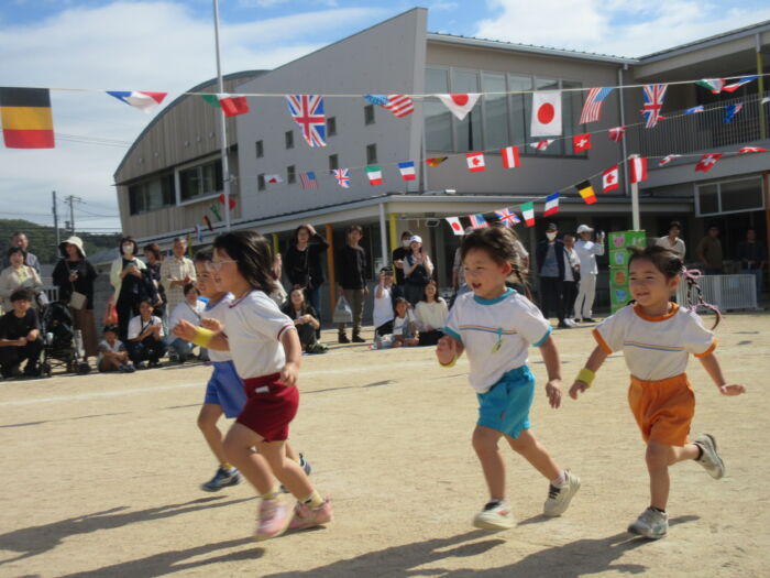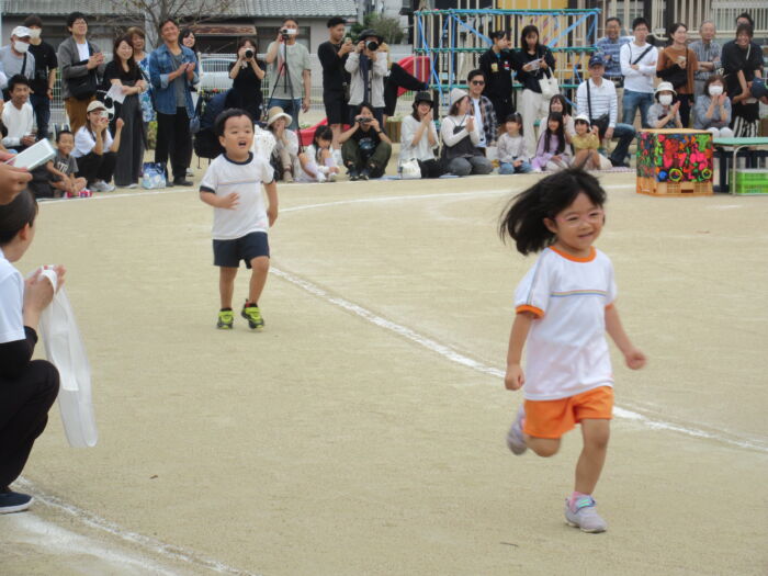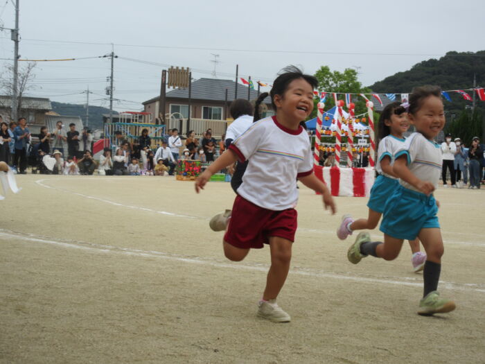 まずはかけっこ、パワー全開でもも組さんらしく元気いっぱい笑顔で走りました!