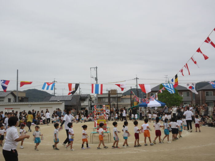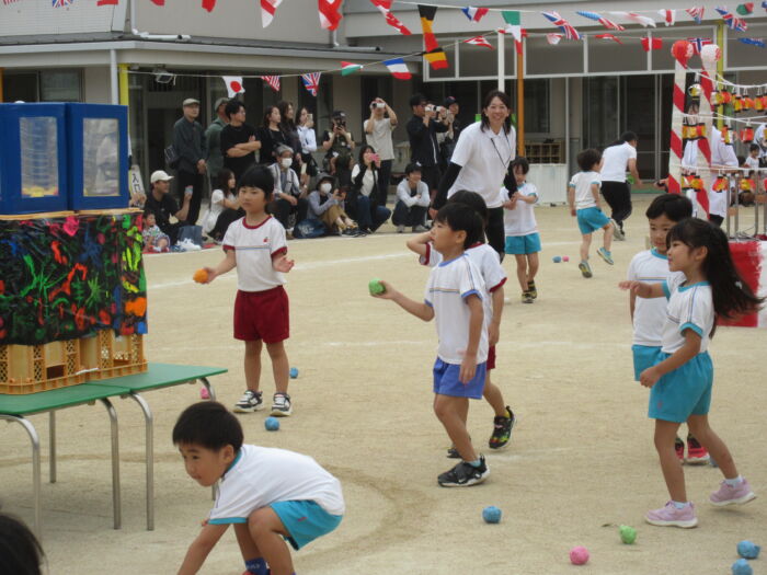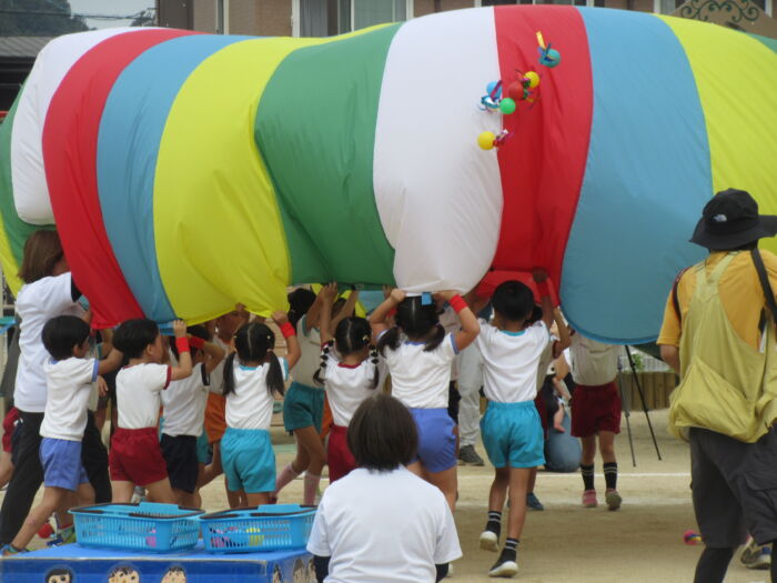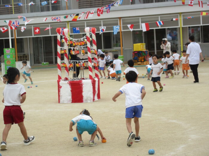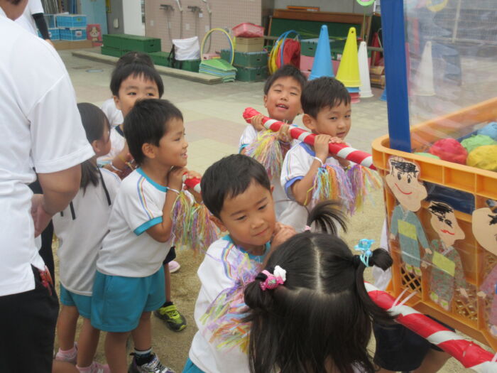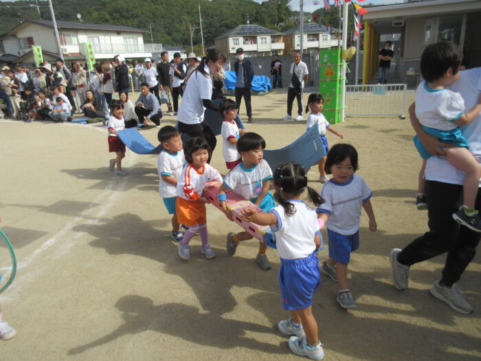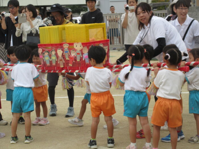 次に、グループ競技です。『力をあわせて!おみこしわっしょい』お神輿を元気に担ぎ、お神輿に玉入れをしたりして楽しく遊びました。さくらさんの頃を思い起すと、重い竹の担ぎ棒もしっかり持てるようになりました!