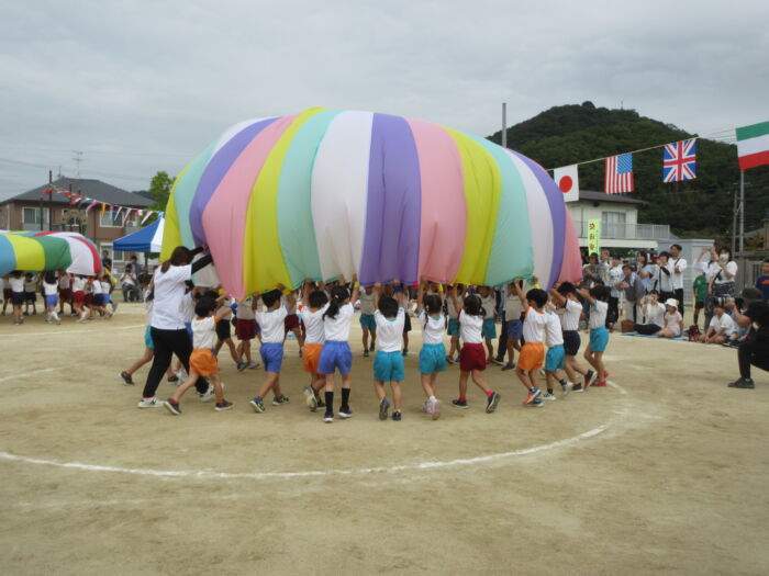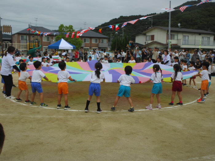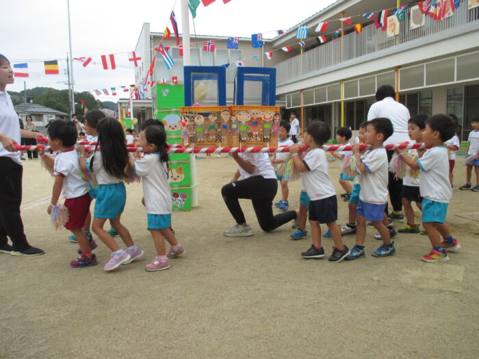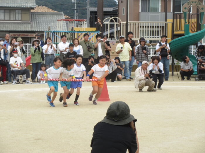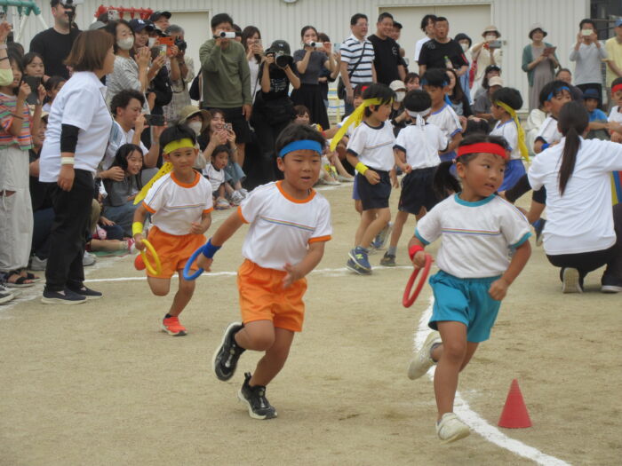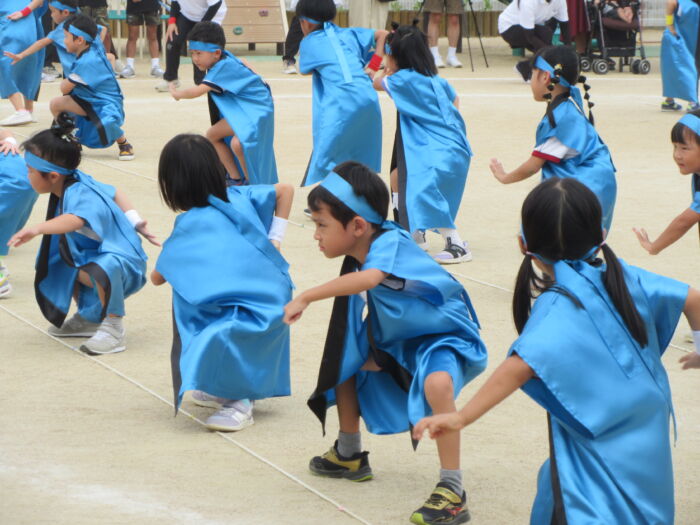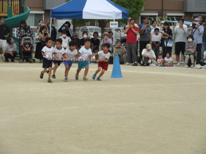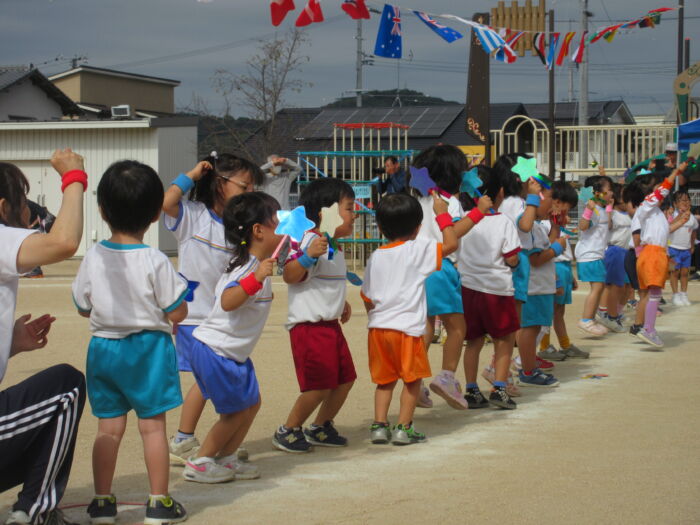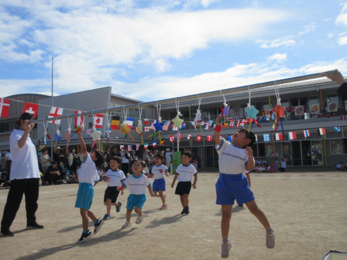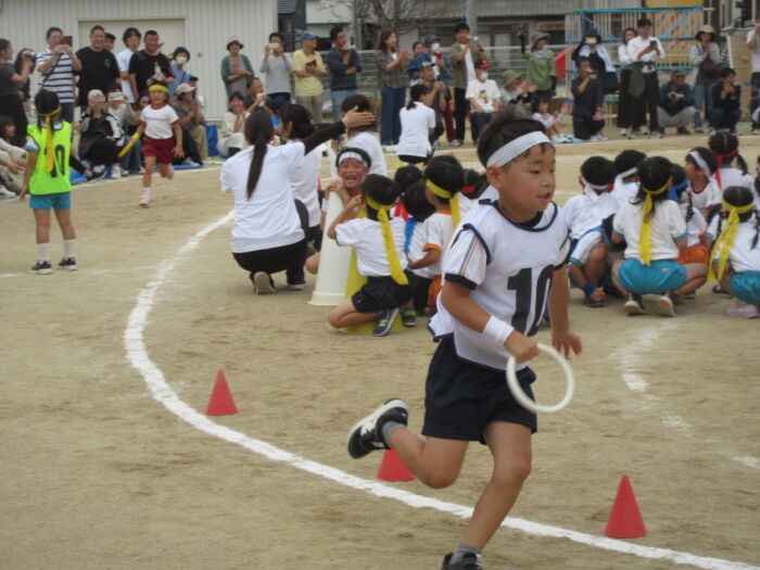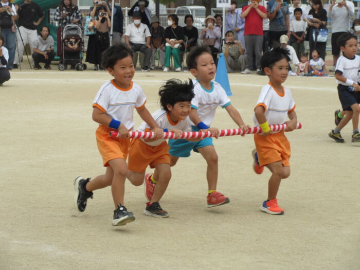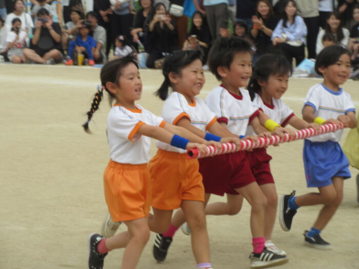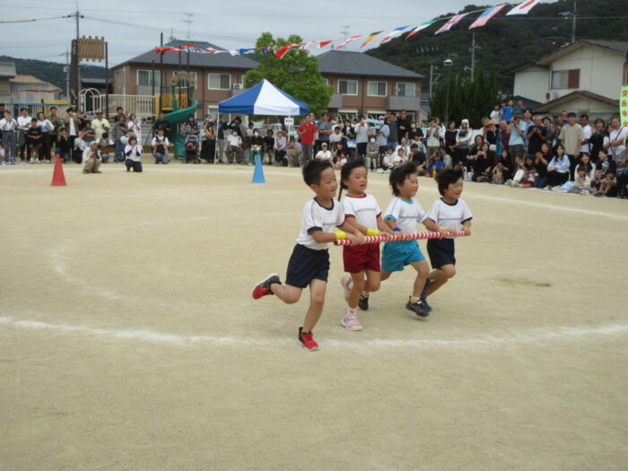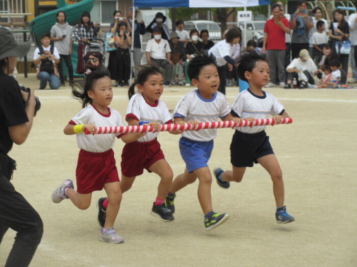 次の種目は台風の目。チームで長い棒を持って、1組、2組で競争です。長い棒を回転させる様は、まさに「暴風」でした!勢いあまって、途中、転ぶ子もいましたが、すぐに一回転して起き上がり、走り始めました。一人脱落できないチーム競技の大切さ、最後まであきらめない気持ち!どれも成長を感じました。